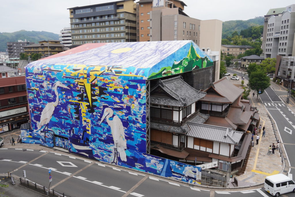 その時撮った写真がこちら。足場を覆っているシートがアート作品になっていて驚きました。愛媛県の宇和島を拠点に活動する画家の大竹伸朗さんのデザインだそうです。
