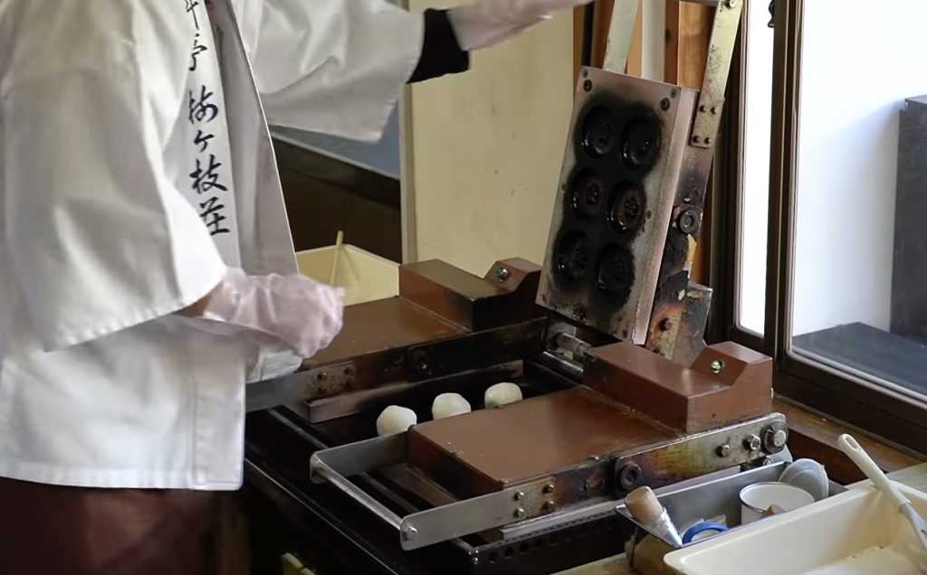 まんまるな大福みたいな生地がぺったんこに、そしてかわいい梅のマークが刻印されます。