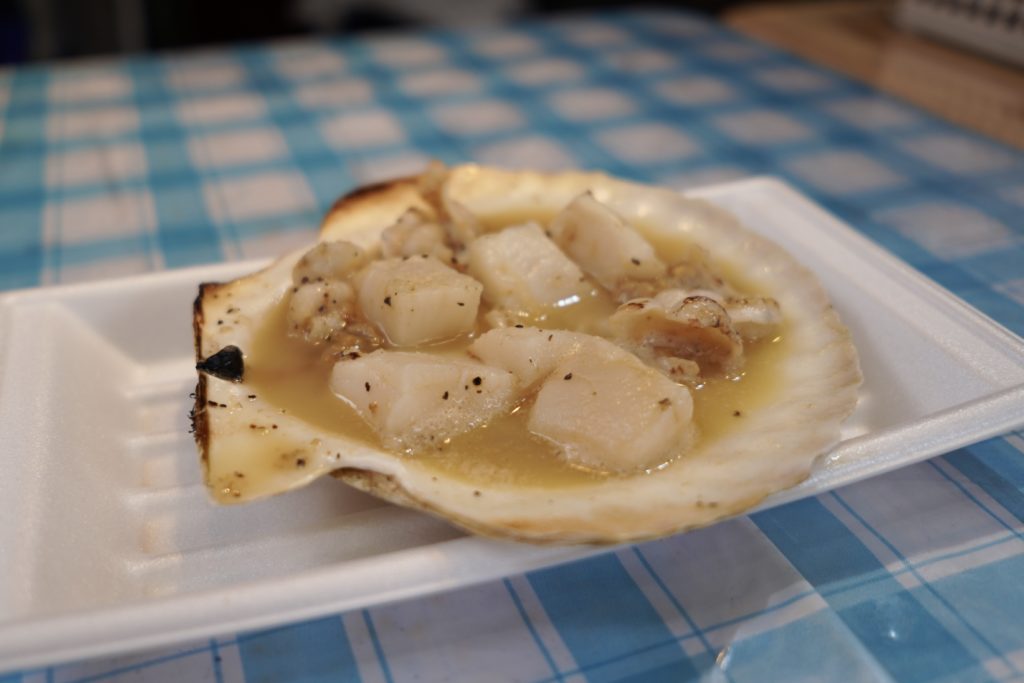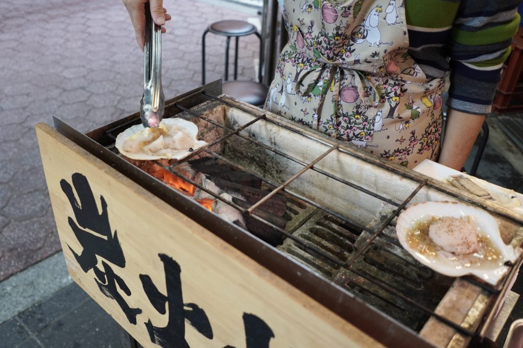 こちらは鮮魚を販売するお店ですが、なんとその場で捌いた海鮮を炭火焼きで頂けるんです!