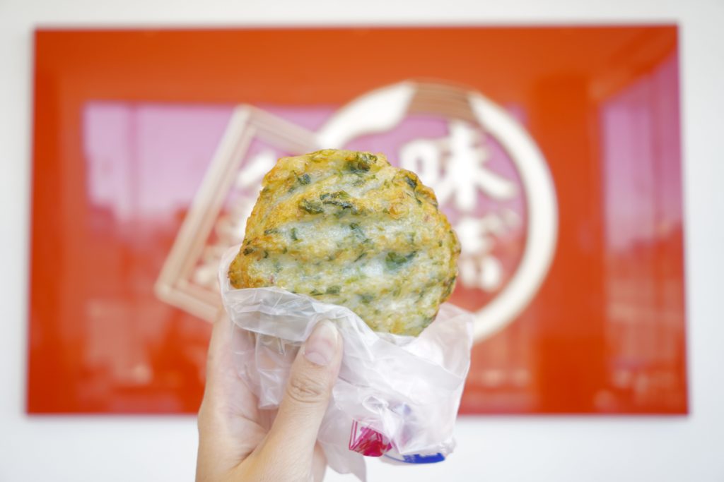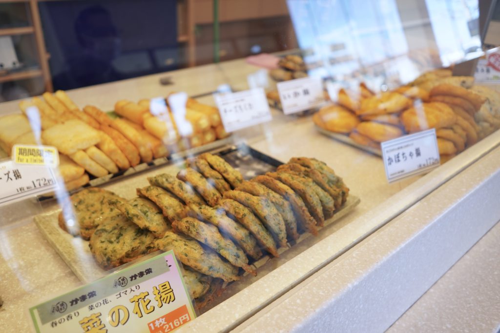 ケースにはいろんなかまぼこが並んでいましたが、今回私は季節の味、菜の花揚216円を選びました。