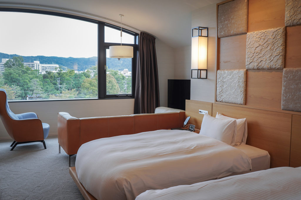 広さ44.12m²、ベッドは2台、可愛らしいアーチ型の大きな窓からは鴨川が一望!とても開放的なお部屋でした。