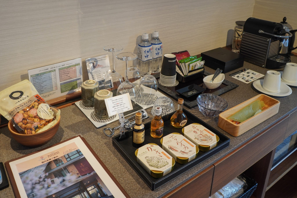 ミニバーには有料のお酒やおつまみの他に、無料で頂けるネスプレッソのコーヒーと「青木光悦堂」の「いろどり豆」がありました。